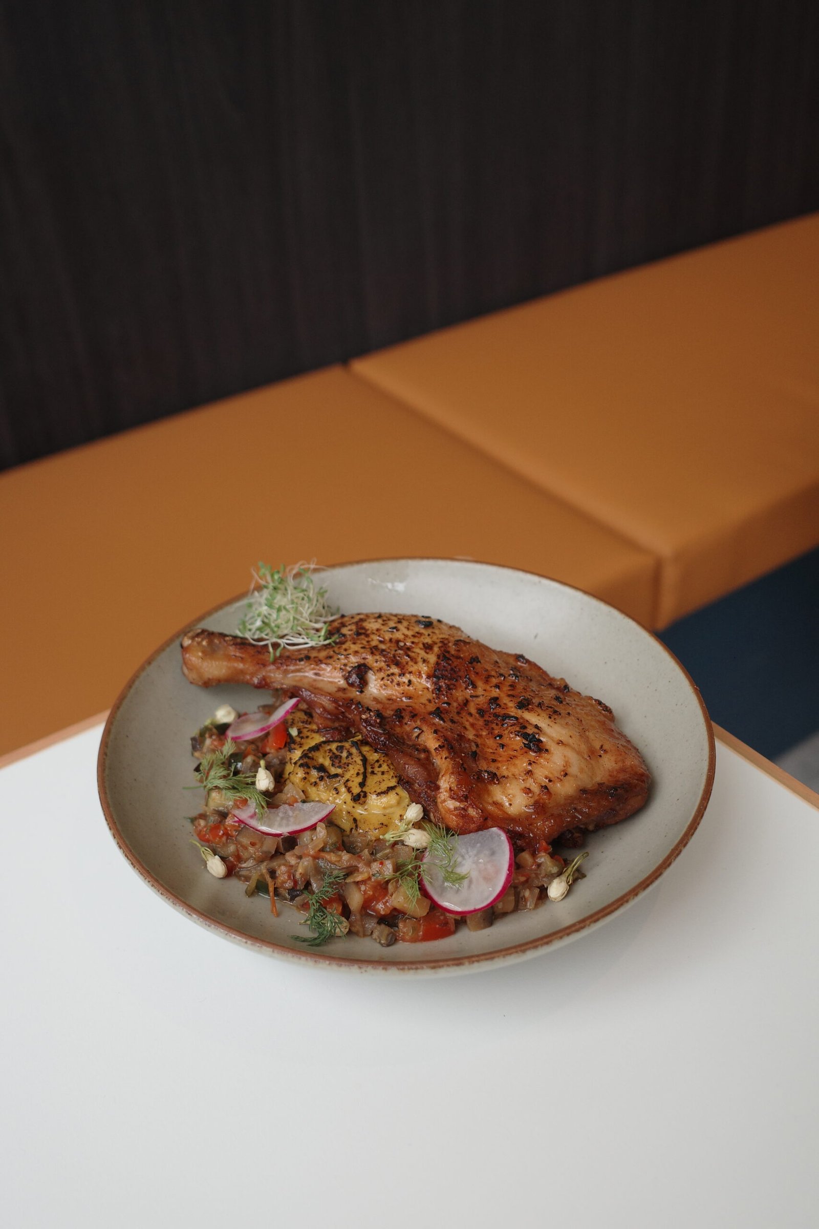 lemon-jasmine marinated chicken leg with pumpkin puree & buttered ratatouille.