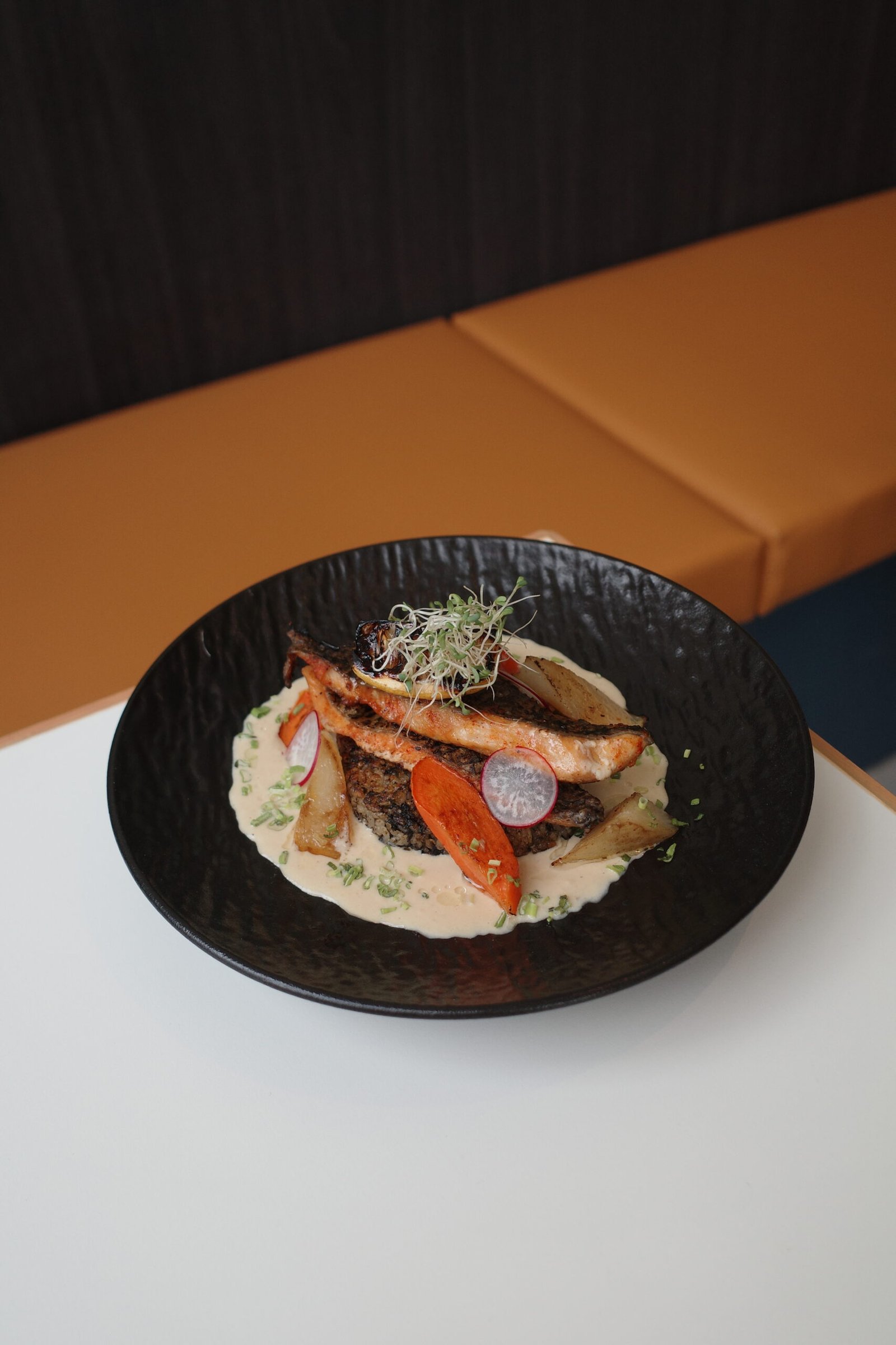 seared tilapia on top seaweed rice crisp served together with miso veloute.